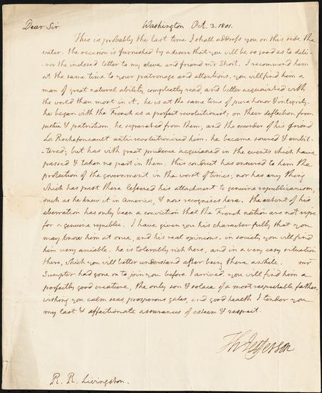 Letter from Thomas Jefferson to Chancellor Robert R. Livingston.