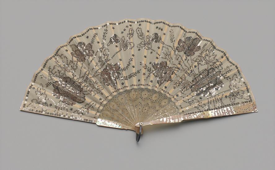 Folding fan of black Chantilly lace leaf with applied gold spangles