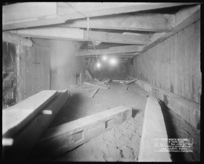 Woolworth Building, sub-cellar, west wall to pit from south end.