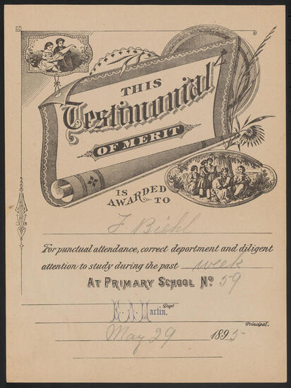 [Testimonial to punctuality, deportment and diligent attention to study.]