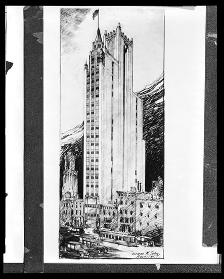 N.E. corner of 6th Avenue and 42nd Street. Fleischmann Building, watercolor rendering by Hughson Hawley, 1906.