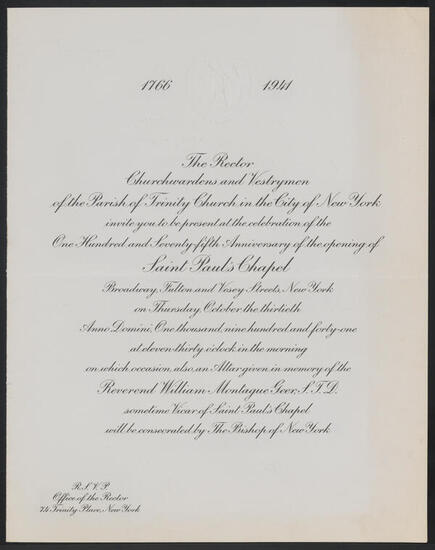 A Service of Thanksgiving to Almighty God in Commemoration of the 175th Anniversary of the Opening of Saint Paul's Chapel