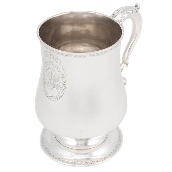 Cann with raised, tulip-shape body, S-scroll handle topped with acanthus-leaf furl, on stepped circular skimmed foot, foot and lip outlined with bright-cut scallops. Inscription: Engraved initials: "M R" in feathered bright-cut script within oval hanging from ribbon bowknot; Scratch weight on base: "oz/14/-/13". Mark: Struck on base: "TU" in rectangle and "I.V" in shield.