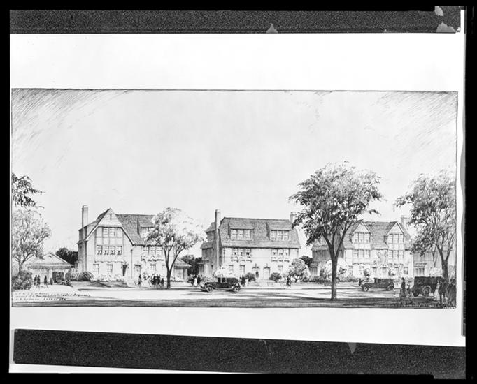 Watercolor, Pelham Parkway apartments, rendering by Hughson Hawley, 1926.