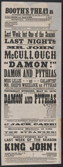 Engagement with the American tragedian, Mr. John McCullough, who will sustain his great role of Spartacus in Dr. Bird's classical tragedy, "The Gladiator", Saturday evening, May 8, 1874