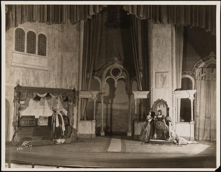 [Julia Adler as Jessica and Horace Braham as Lorenzo in the balcony scene of "The Merchant of Venice".]
