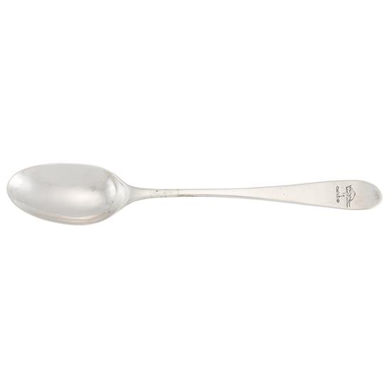 Teaspoon with egg-shaped bowl, straight handle with rounded end and faint back tipt. Inscription: Engraved on handle obverse: [Buchanan crest.] | Mark:
