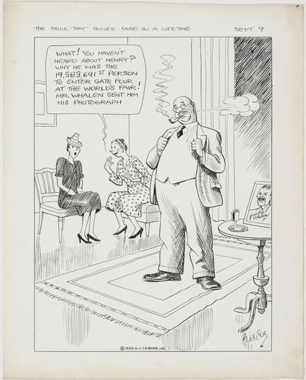 Mr. Milquetoast is asked by a Californian and a New Yorker if he is going to the World's Fair.