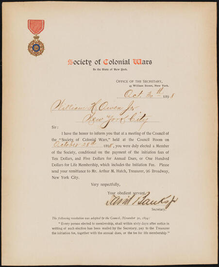 [Certificate of membership to the New York Society of the Order of the Founders and Patriots of America.]