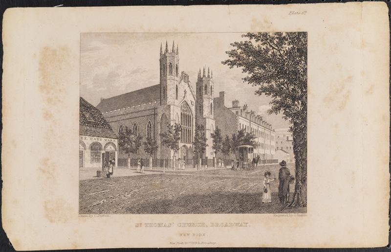 A. St. Thomas' Church, Broadway; B. Park Theatre and Part of Park Row
