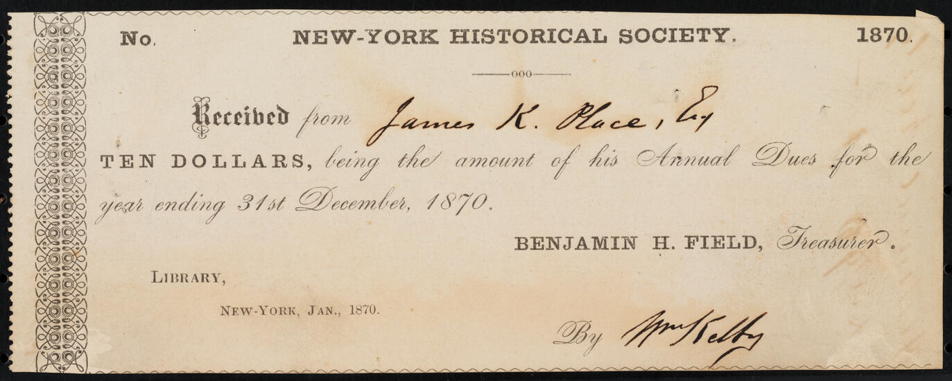 Received, New-York, February 19 1869, from James K. Place Sixty Dollars, being his annual dues in advance