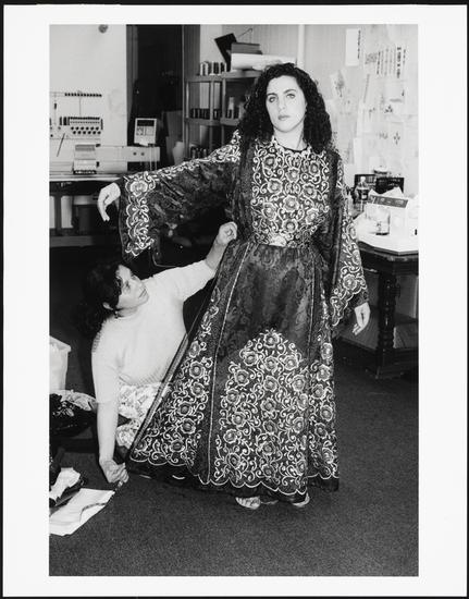 [Groom's mother guarding the wedding cakes at a Palestinian wedding at Widdi's Catering Hall.]