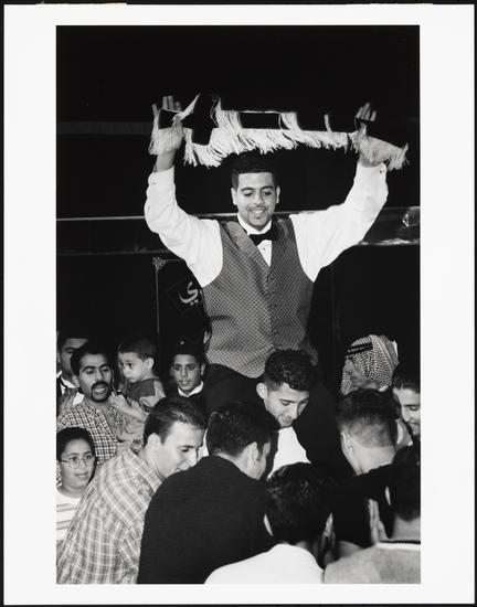 [Young man dancing at a Palestinian wedding at Widdi's Catering Hall.]