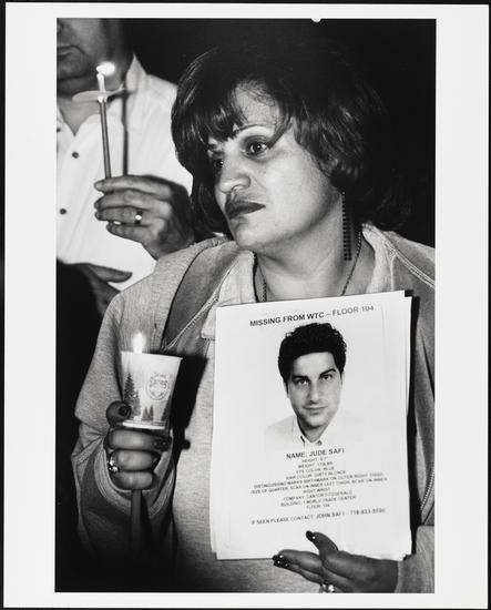 [Groom's mother guarding the wedding cakes at a Palestinian wedding at Widdi's Catering Hall.]