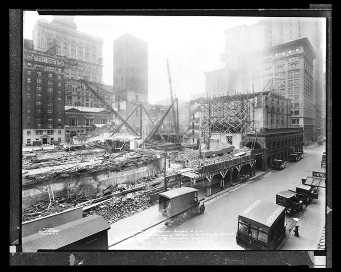 Madison Square Garden, demolishing, record view, from northeast corner of plot at 27th Street and 4th Avenue looking southwest towards 26th Street, 12:47pm.