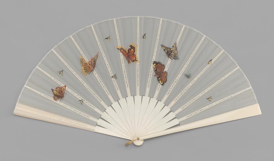 Folding fan of lace-overlaid satin leaf with painted central medallion