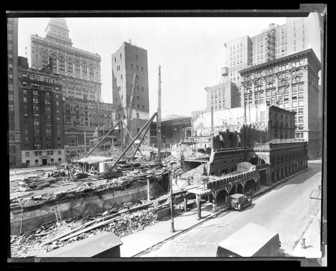 Madison Square Garden, demolishing, record view, from northeast corner of plot at 27th Street and 4th Avenue looking southwest towards 26th Street, 12:47pm.