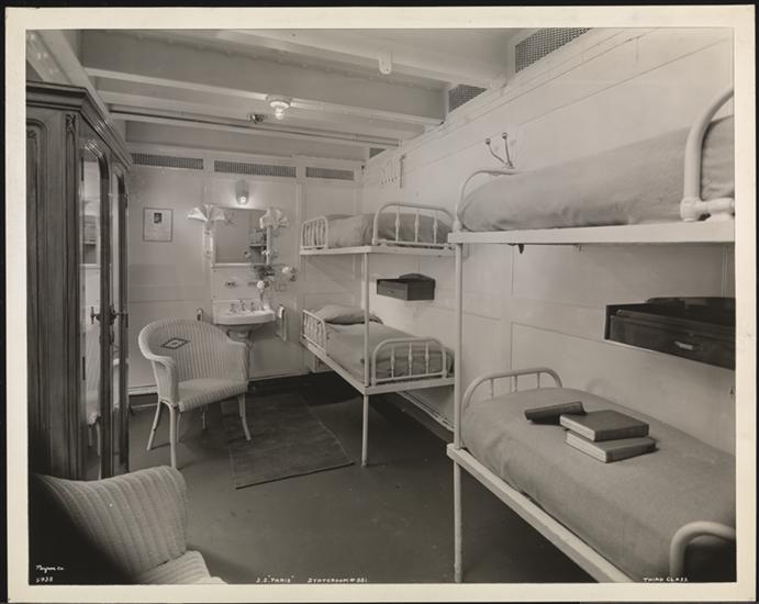 French Line, S.S. "Paris" Pier 88 N.R., Third Class, Interior, Inside 4 Berth Cabin #821.