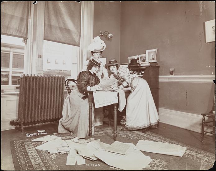 A group of actresses of London's Gaiety Theatre Burlesque Company appearing in a production of "In Town" (imported from London by Charles Frohman), reading notices in the offices of the Knickerbocker Theatre, New York City.