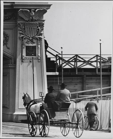 [Bicyclists passing under wooden arch at the opening of Grant's Tomb]