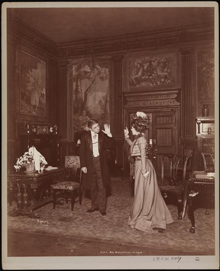 A scene from the New York production of Fabrice Carre and Paul Bilhaud's play "My Daughter-In-Law," featuring the Charles Frohman London Comedians including Herbert Standing, Seymour Hicks, Ferdinand Gottschalk, Fannie Brough, Josephine Gautier, and Ellaline Terriss.