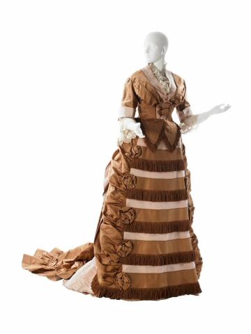 Visiting dress in brown striped and lavender satin