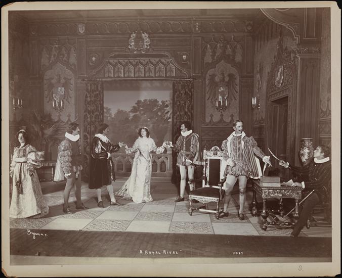 A scene from Gerald du Maurier's "A Royal Rival" presented by Charles Frohman at the Criterion Theatre in 1901-1902, featuring William Faversham as Don Cesar de Bazan and Julie Opp as Marita.