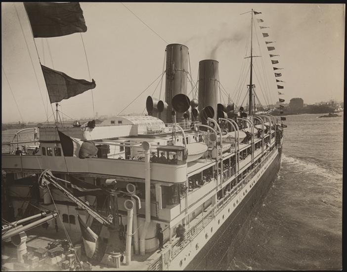 Inscription / technical details "S.S. Hamburg leaving her dock, Hoboken N.J., Ex-Pres. Roosevelt on board" pencilled on verso of similar print.