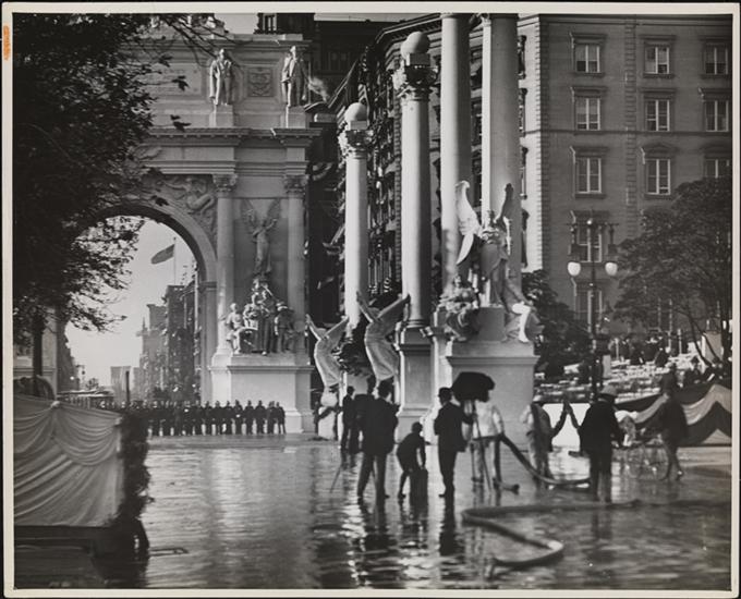 [Policemen in front of pylon of Dewey Arch]