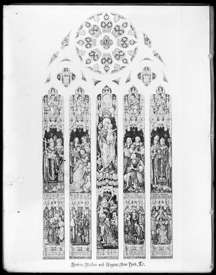 [Rendering of stained glass window with panels depicting Christian scenes.]