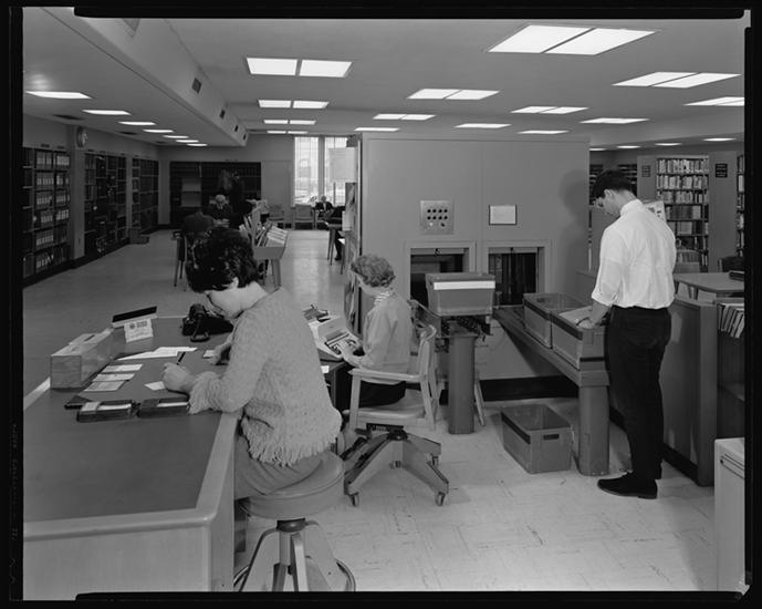 280 Fulton Street. Brooklyn Public Library, Brooklyn Heights branch, interior view of main lobby desk, people.