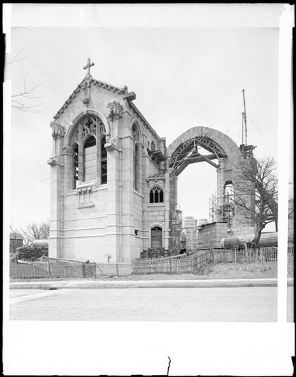 Amsterdam Avenue and 112th Street. Early Construction work on Cathedral of St. John the Divine. View of Arch.