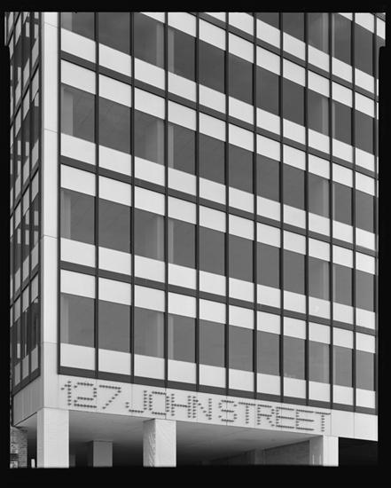 One State Plaza Building, detail of curtain wall, lower part State Street, side.