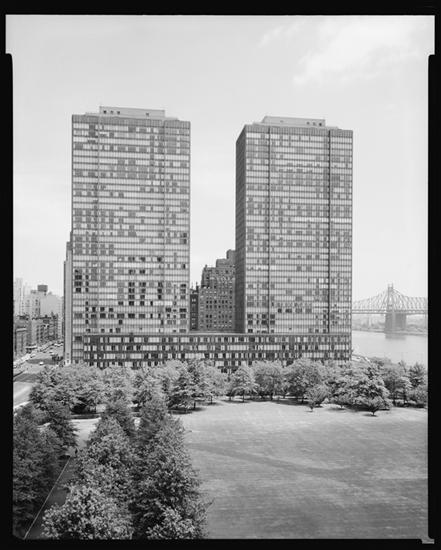 United Nations Plaza Apartments, aerial view looking S.W. from East River near 50th Street.