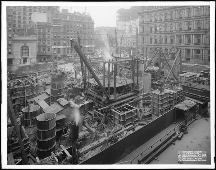 Broadway between Barclay Street and Park Place. Woolworth Building foundation work, bird's eye view from Barclay St..