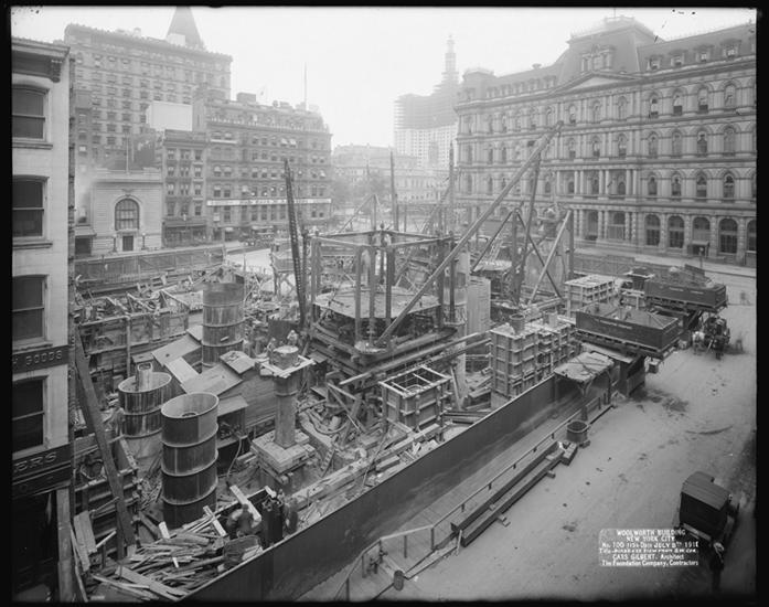 Broadway between Barclay Street and Park Place. Woolworth Building foundation work, bird's eye view from Barclay St..