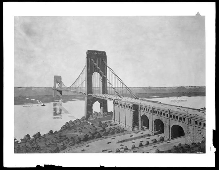 Hudson River Bridge, N.Y. Approach, rendering by John T. Cronin, 1928.