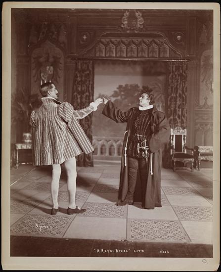 A scene from Gerald du Maurier's "A Royal Rival" presented by Charles Frohman at the Criterion Theatre in 1901-1902, featuring William Faversham as Don Cesar de Bazan and Julie Opp as Marita.
