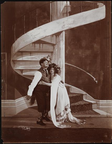 A scene from Weber and Fields' burlesque of Clyde Fitch's translation of Alphonse Daudet's "Sapho" called "Sapolio," a "Clean travesty of 'Sapho'" presented at the Weber and Fields Music Hall in 1900.