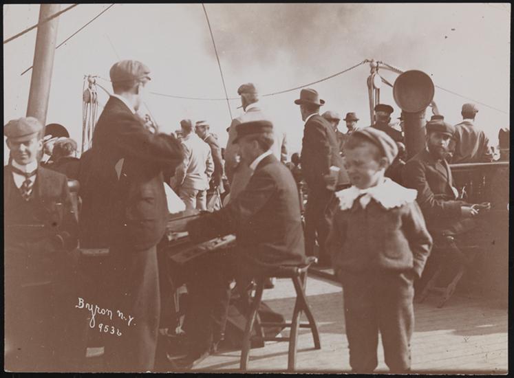 A man playing a keyboard instrument as a boy and man look on deck of the S.S. "Deutschland".
