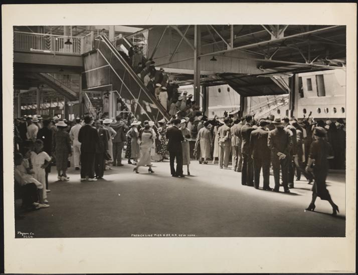 French Line, 610 Fifth Ave., "Normandie" Leaving Pier #88 N.R., Pier Scenes, Passengers Entering Elevators on Upper Level.