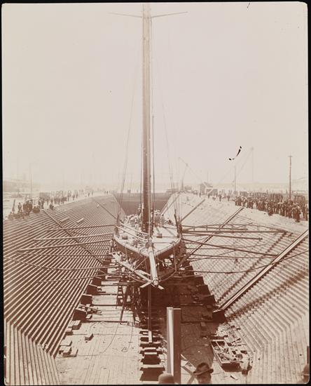 The yacht "Valkyrie" docked at an unnamed pier. Sailors work on the boat.