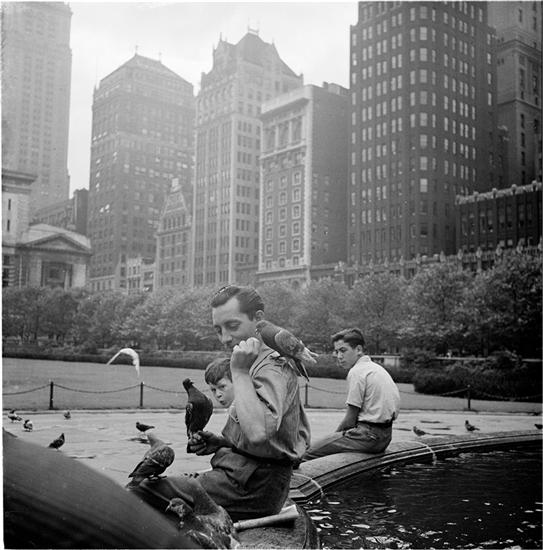 [Men sitting on the Lowell Fountain in Bryant Park.]