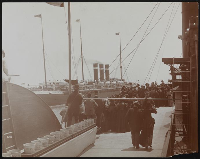 American Line, S.S. "New York", Group Waving to Passengers on Boat.