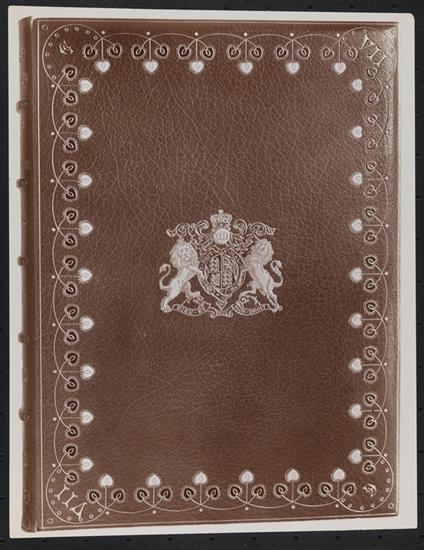 Close-up of a leather book cover with gilt decoration by Walter Dunn, publisher; "Prayer Book of Edward VII, 1903" visible on the spine of this cover in similar print.