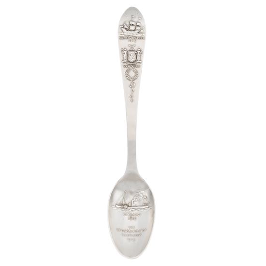 Sterling silver teaspoon commemorating the Hudson-Fulton celebration with pointed, slightly downturned handle, handle double die-struck, and the obverse decorated with an image of a sailing vessel. Inscription: Engraved on handle obverse: De Halve Maene / 1609 / Excelsior / New York. Engraved on bowl obverse: Clermont / 1807 / The / Hudson-Fulton / Celebration / 1909. Mark: Marked on handle reverse: TIFFANY & CO. [diamond] STERLING M.