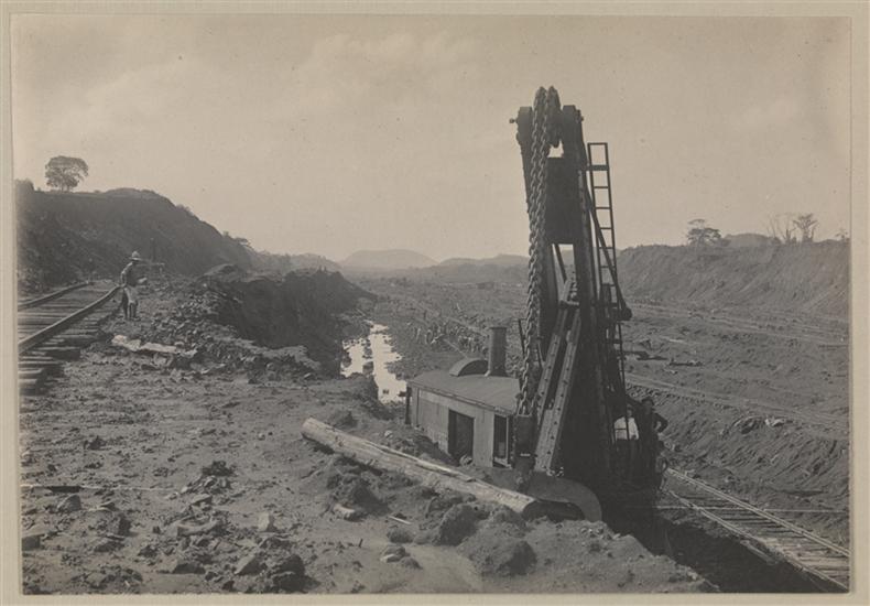 Laborers digging the Panama Canal; railroad tracks through trench and some sort of digging machine in foreground.