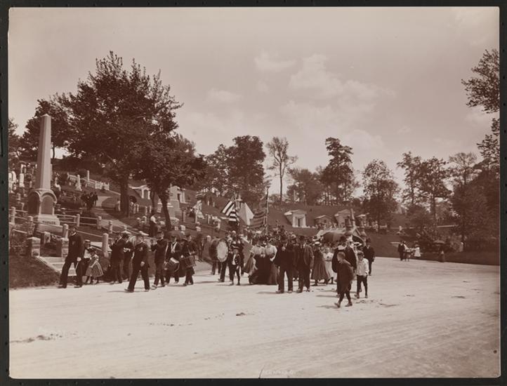 Crowd at Greenwood Cemetery on Decoration Day, 1899. With sepulchral monuments and marching band.
