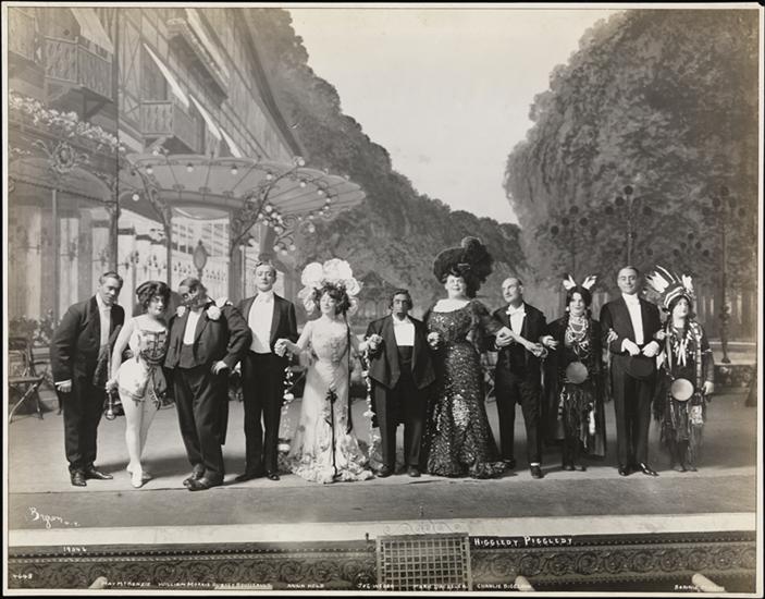 The cast of "Higgledy-Piggledy" featuring May McKenzie, William Morris, Aubrey Boucicault, Anna Held, Joe Weber, Marie Dressler, Charles Bigelow and Bonnie Magin on the set at the Weber Music Hall in 1904.