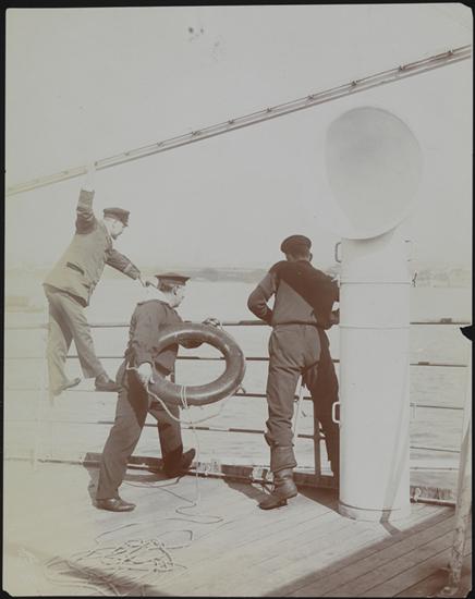 Crew members throwing a life-preserver off a deck of the S.S. "Kaiserin Auguste Victoria".